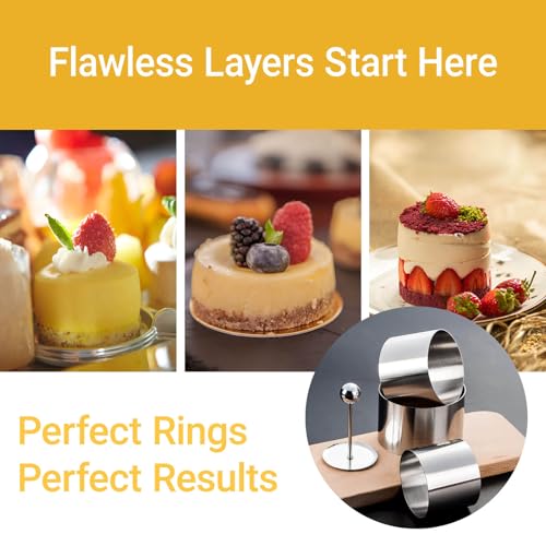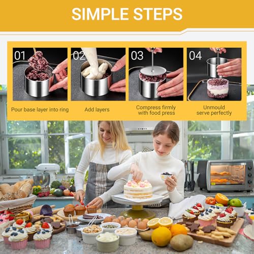 - 【FOR BULK BAKING】10 sturdy steel rings (8cm diameter) + weighted food press + angled spatula, crafted for batch baking desserts like layered cheesecakes and uniform crumpets.
