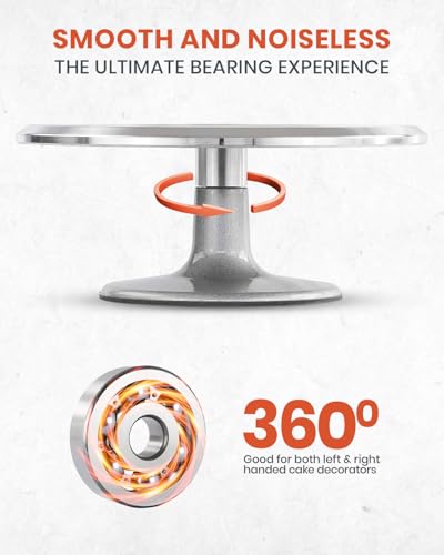 - HEAVY DUTY NON-SLIP TURNTABLE: This cake spinner, made from aluminium alloy, features a non-skid rubberised base that ensures excellent stability on countertops. It rotates smoothly with concealed ball bearings, aiding in precise cake crafting for birthdays, weddings, and more. The cake platter includes lines to assist in positioning your cake.