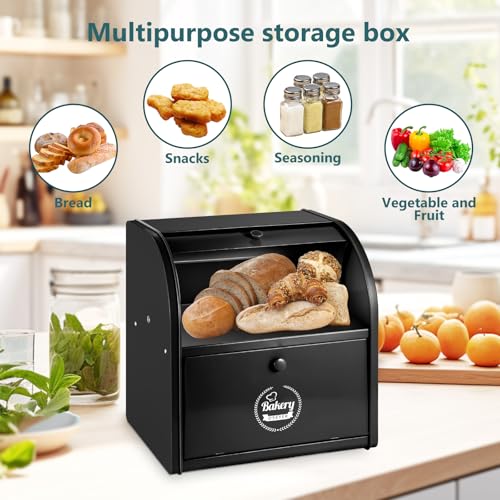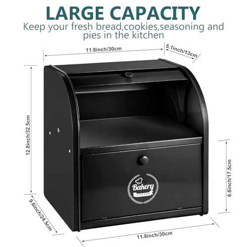 Dyserbuy 2-Tier Bread Bin, Kitchen Storage Box with Roll Top Lid, Metal Container for Fresh Loaves, Cookies, Pastries 30 x 25 x 33 cm (Black)