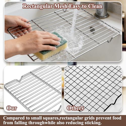 - 【Scientific Mesh and Elevated Design】The cooling racks for baking feature a uniformly distributed mesh pattern that promotes optimal heat circulation, while the raised base design enhances stability, ensuring even heating or cooling of food. The distinctive elongated mesh minimises contact points, effectively preventing food from adhering and accumulating grease.