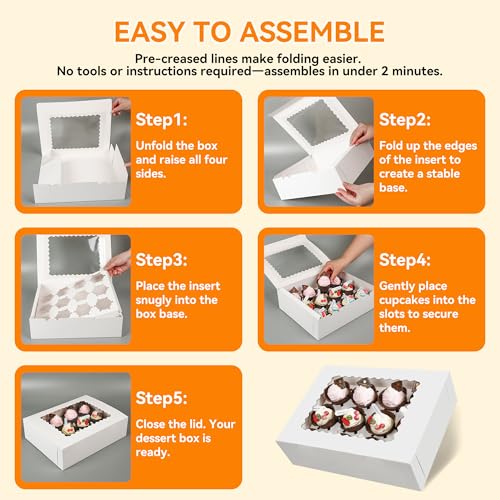 - ✅【WHAT’S INCLUDED】 – 3-pack of cupcake boxes and 3-pack of cardboard inserts; these cupcake storage boxes are simple to assemble. The dimensions of the assembled cupcake box are 12.8 x 9.8 x 3.6 inches.