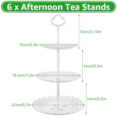 • Value Package: This set features 6 three-tier cake stands, each with a total height of 40.5 cm (16 inches) and diameters of 22 cm (bottom layer), 18.5 cm (middle layer), and 15 cm (top layer).
