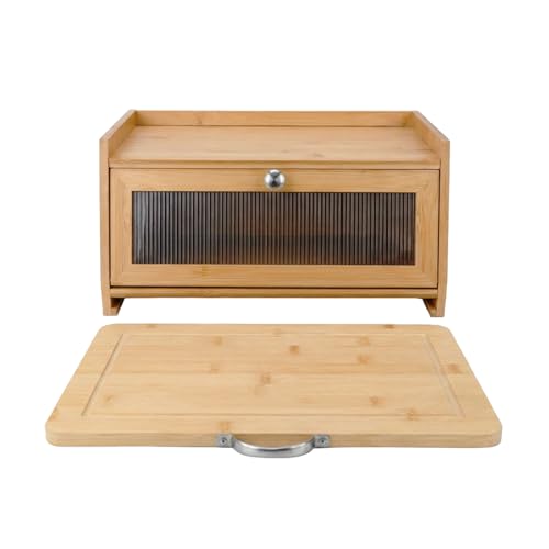 • INNOVATIVE BUILT-IN CUTTING BOARD: Save counter space and time! This bread box includes a unique slide-out bamboo cutting board, allowing for seamless transition from storage to slicing in seconds without the hassle of searching for additional boards.