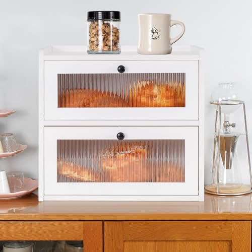 GUUSII HOME Wooden Bread Bin – Double Decker Kitchen Storage Box for Fresh Homemade Bread & Veggies – Vintage Design 36.5x24x34 cm (White, L)