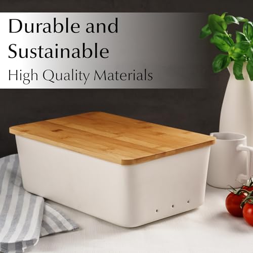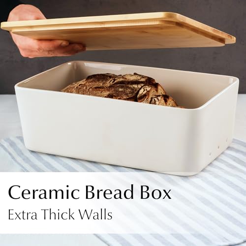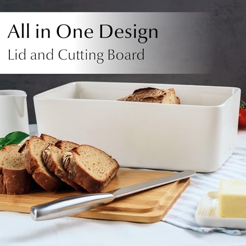 MIAMIO – Elegant Ceramic Bread Box with Bamboo Lid and Cutting Board for Kitchen Countertop – 32 x 20 x 11.5 cm (White)