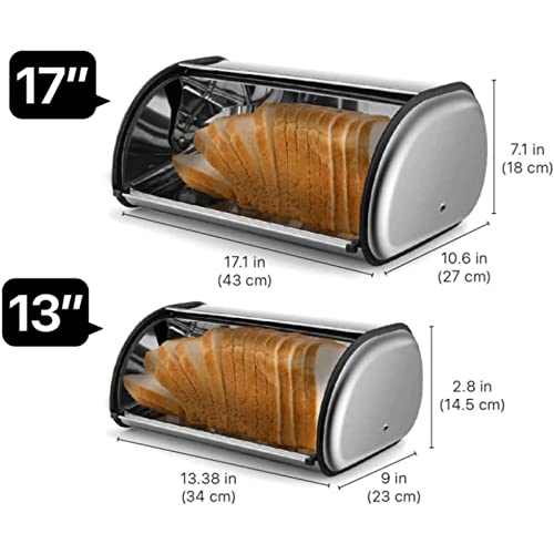 - Dimensions: 17″: 43x27x18cm/17.1×10.6×7.1″, 13″: 34x23x14.5cm/13.38x9x2.8″. This spacious bread bin is crafted from durable stainless steel.