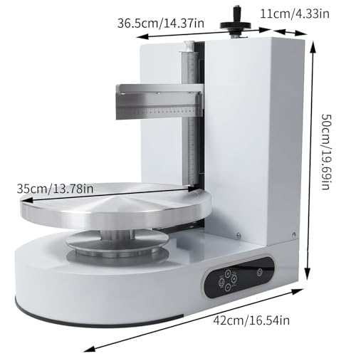 Engineered to fit cakes ranging from 4 to 12 inches, this machine boasts a 35cm diameter turntable and an adjustable scraper for precise control over frosting thickness, ensuring minimal waste and flawless cakes for any celebration.