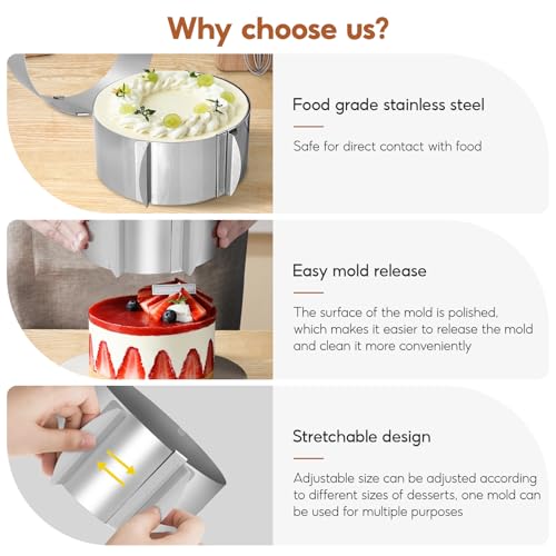 - Easy to Use: This stainless steel round mould features two handles for excellent handling. The ring can be effortlessly removed by expanding it without harming the cake.