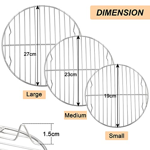 - 【MULTI-PURPOSE】This set includes 3 cooling racks in sizes 19cm, 23cm, and 27cm, making them suitable for baking, cooling, cooking, roasting, steaming, grilling, and protecting. These sturdy wire racks are ideal for cooling cookies, meats, cakes, and bread.