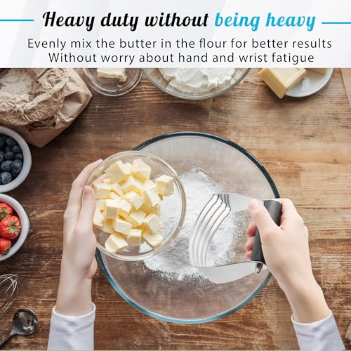 • Durable Stainless Steel Construction: Made from high-quality stainless steel, this professional dough mixing tool features robust, sharp blades for seamless cutting and blending of butter, pastry, and dough. Ideal for pie crusts, biscuits, scones, and sourdough, its sturdy yet lightweight design guarantees longevity while maintaining agility. Perfect as a hand mixing implement, it evenly distributes weight for effortless blending, making it indispensable for lattice work and short crusts, while resisting wear during demanding kitchen tasks.