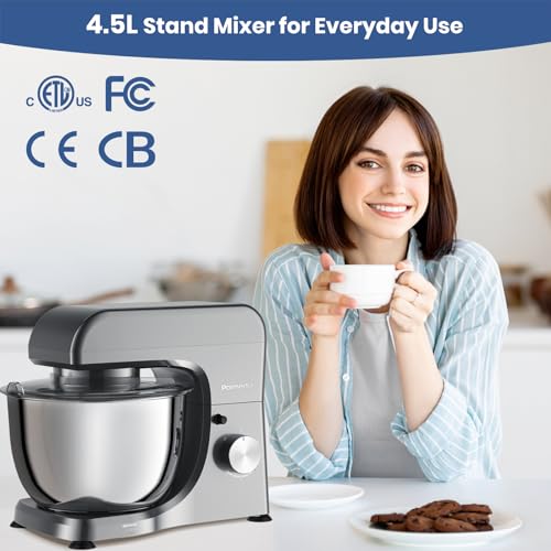 Parmedu Electric Kitchen Stand Mixer: 1000W 8-Speed Compact Tilt-Head Food Mixer – 4.5L 304 Stainless Steel Bowl with Cover & Egg Whisk & Dishwasher Safe Dough Hook & Flat Beater