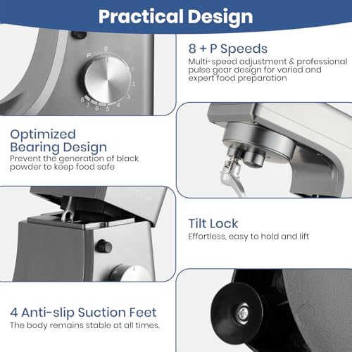 - Effortless Tilt Lock & Optimised Bearing Design Say farewell to cumbersome handling! Our household mixer features a tilt-lock mechanism that makes it easy to hold and lift. The optimised bearing design of the stand mixer prevents the generation of black powder and ensures food safety.