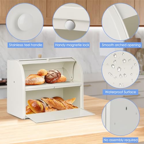 Esilihom Extra-Large Cream Bread Bin with Roll Top Lid – 2-Layer Kitchen Storage Solution for Loaves, Pastries & Cookies (40cm x 24cm x 32cm)