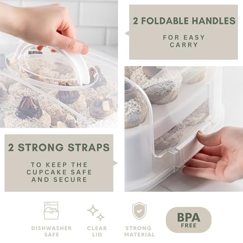 - Compact Storage: Enjoy the convenience of a 3.5” capacity on both the upper and lower trays, providing ample space for your delights to shine. The lower tray cleverly folds for effortless storage of the cupcake carriers.