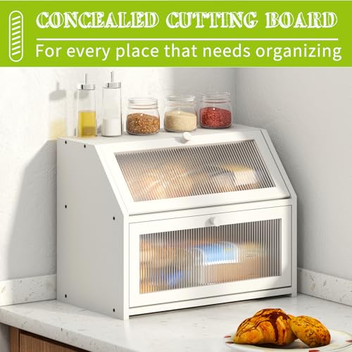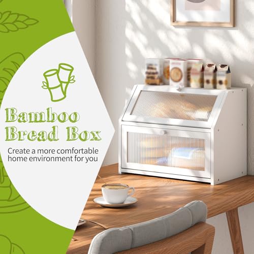 BMOSU Farmhouse Bread Box – White Bamboo Wooden Large Capacity Bin with Frosted Window, Double Layer for Storing 2 Loaves and More