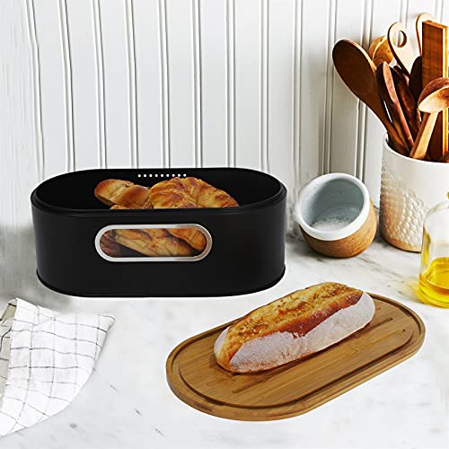 Large Metal Black Bread Box with Cutting Board – Farmhouse Style Kitchen Bread Bin (17 x 8 x 7 inches)