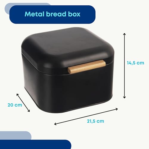 - COMPOSED OF METAL – This bread bin is constructed from durable, black metal, measuring 21.5 x 20 x 14.5 cm externally.