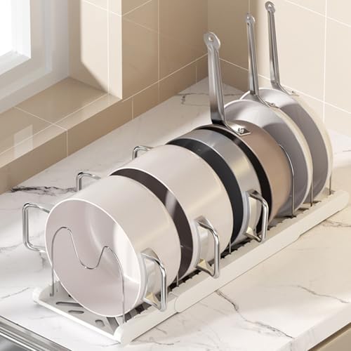 Expandable Pan Organiser for Cupboard Storage, White Rack with U-Shaped Lid Holder, Anti-Scratch Non-Slip Stand for Pots, Pans, and Trays