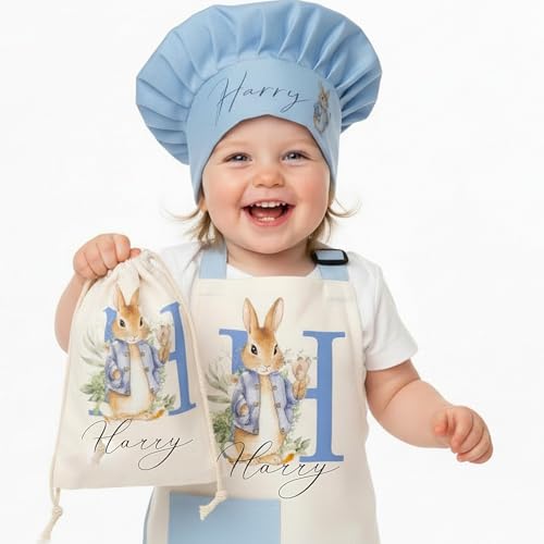 Customised Children’s Apron & Chef Hat Baking Set | Personalised Blue Linen Rabbit Pinafore | Spring Floral Initial Design | Ideal Keepsake for Christmas & Easter