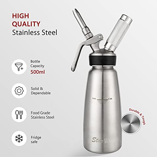 Professional Stainless Steel 304 Whipped Cream Dispenser – Durable 1 Pint (500 ml) Cream Whipper with 4 Tips & Brush, NO-LEAK Whipping Siphon Canister, Gourmet Cream Maker (SS-S)