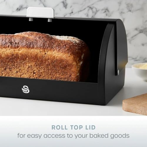 - Swan Serenity Bread Bin – The ultimate storage solution to keep your baked goods fresh and accessible on your kitchen worktop. The roll-top lid, complete with a large bar handle, makes the bread bin effortless to open. Its ample 14-litre capacity allows for a variety of loaves, muffins, bagels, or crumpets, perfect for bustling family homes. Ventilation holes at the back regulate moisture and enhance airflow, preventing stale odours and keeping your baked goods fresher for longer. The robust, stylish matte smooth body is designed for everyday durability, while non-slip feet provide stability on your worktop.