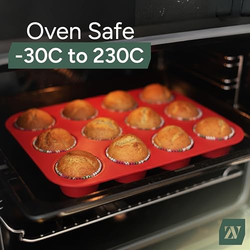 Zuvo Silicone Muffin Tray for 12 Muffins – Non-Stick Baking Moulds for Cupcakes & Brownies – (23x31cm) Red Baking Pans