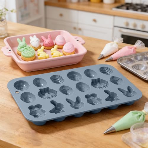 - 18-cavity silicone cake mould designed for versatile baking, perfect for Easter confections, cookies, and chocolates.