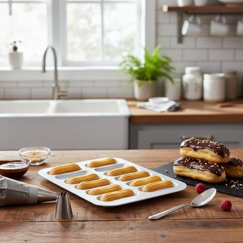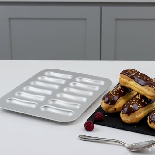- Made in England premium silver anodised 12 eclair tray by Samuel Groves. Handcrafted in Birmingham since 1817 for even heat, durability, and professional non-stick baking performance.