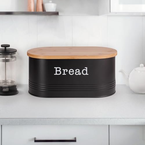 EHC Space-Saving Extra Large Bread Storage Bin with Wooden Lid for Kitchen, Round Enamel Canister Jar in Black