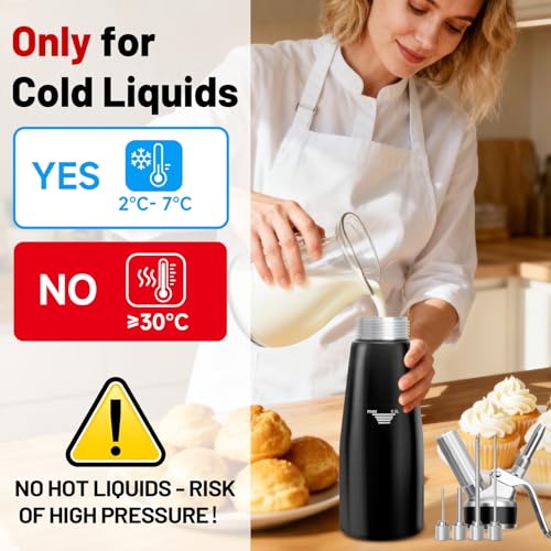 - Robust & Sturdy Whipped Cream Canister: Experience the heavy-duty sensation with this all-aluminium canister and dispenser head. Easy to grip and resistant to corrosion for prolonged life. The 500ml capacity is ideal for both home dessert enthusiasts and professional chefs, with 304 stainless steel decorating nozzles for stunning whipped cream artistry.
