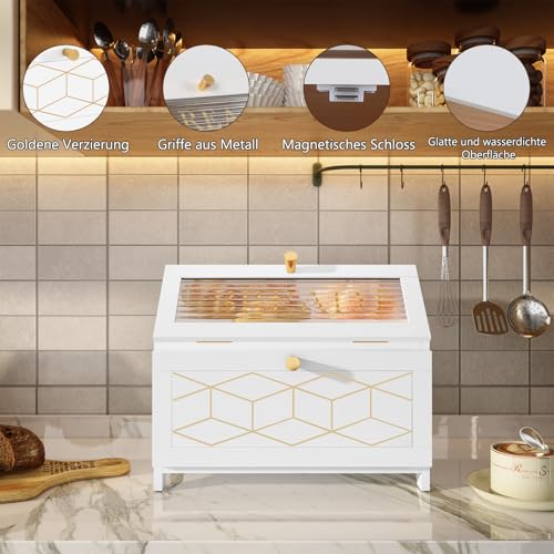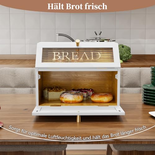 MROJISC Wooden Bread Bin with 2 Tiers – Large White Storage Box with Transparent Window for Kitchen Worktop & Food Preservation