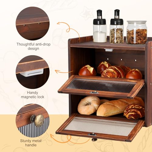 - Spacious Wooden Bread Bin for Fresh and Delicious Breads This bread box boasts ample space for personal and family use. Its generous design prevents bread from being compacted, while the dual-layer structure keeps your kitchen organised without occupying too much countertop area. The classic bread box ensures your bread remains fresh for extended periods.